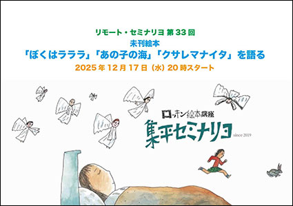 | 3/18(水) 20:00〜 | リモート・セミナリヨ 第36回 『見えない絵本』を語る | ZOOM配信(録画視聴可) 集平セミナリヨ メール Facebook | 参加費2,000円 |