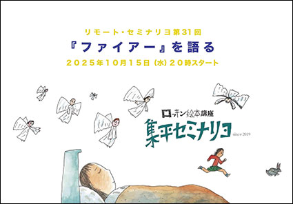前回までに語った還暦3部作のあと、10年の間に集平絵本は『ファイアー』1冊しか出版されていません。この絵本の裏表紙にいるトリゴラスは溜め込んできたものを吐き出すように町を火の海にしています。コロナ禍に出た絵本の多くは、プロ野球やプロレスの無観客試合がそうだったように、歓声も拍手も受けませんでした。実は編集者の提案で集平さんはこの絵本に出てくる子どもたちがそれぞれ『ファイアー』の前日をどう過ごしていたかを「その前の日」という小説にしています。絵本と小説のモンタージュで重層的な物語世界を解き明かすという画期的な試みです。しかし、このテキストは出版されませんでした。なぜか…そんな話も聞けるかもしれない次回のセミナリヨ、どうぞお見逃しなく!(齋藤)