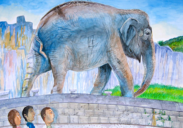 佐世保市亜熱帯動物園の花子を見て、大きいなと思った。この絵は実際の花子より大きく描いた。ぼくは小さいころ、姫路動物園のゾウの花子を後ろから見て、お尻をタテ長の画用紙いっぱいに描いたことがある。大きなゾウのお尻だけを描いた絵を見てセンセイは首をかしげるばかり。