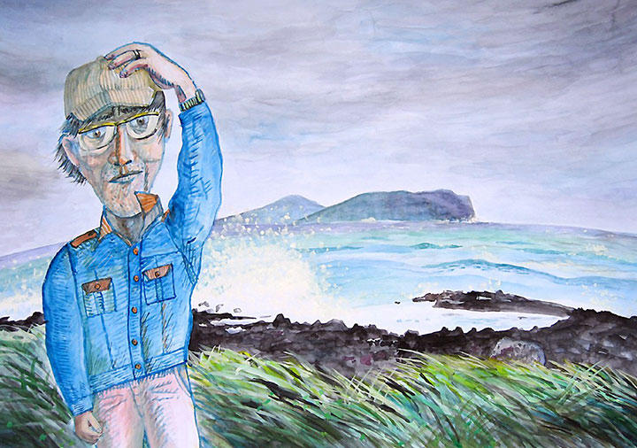 第3楽章 秋 27 台風接近中 ----五島市三井楽町 長崎は台風の西側になることが多くて、比較的被害が少ない。たまたま五島で見た台風接近中の海は、荒れているのに青く透き通って異様に美しく、心の中を直視するようで怖かった。向こうに見えるのは流刑の地、嵯峨ノ島。小さな教会がある。この絵はサラッと見過ごされるが、込めたものは単純ではない。