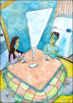 今でも長谷川君たちをぼくは描けるだろうか、という不安を持ちながら描き始めました。緊張しました。四日市の児童書店メリーゴーランドのために昔のスタイルを模倣してコンピュータで葉書用の絵を描いた(今回のフェアに出品しました)ことはあったんですが、長い間、長谷川君たちを描くことを自ら禁じていました。振り返らず行こうと決めたのです。