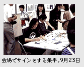 9日に会場で行われた集平のトーク&ライブも盛会でした。約70人のお客さんの中には、高校の恩師や地元の友人といった顔なじみから、遠く県外から駆けつけてくださった方もありました。満員のお客さんと原画に囲まれて絵本を読み、ギターを弾いて歌ったあとは、活発な質問コーナーにサインの列。最近一番のホットでいい時間になりました。